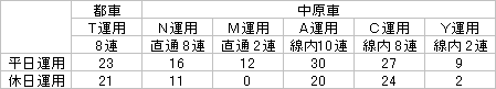 (4)早朝ダイヤ 列車時刻表(05時台下り) 列車時刻表(05時台上り) なお,この中で特記すべき列車は,淵野辺04:35発の新宿行で,この列車は神保原で中原本線の急行西高島平行に接続し,さらにこの列車は品川で京急の羽田空港行に接続しており,羽田の始発便に接続が可能である。 同時に新宿周りでも品川周りでも東京駅の始発新幹線に接続可能な列車でもある。淵野辺始発であることから,多摩地区はもとより相模原地区から羽田・東京の双方にアクセス可能となっている。 (5)深夜ダイヤ 早朝同様,保守作業の時間の確保や労務環境の見地から終着は01:00を基本としている。但し,入庫の都合から回送列車を含み01:30頃まで列車が運転されている。 下り列車は時間と共に運転間隔が長くなる。 なお,終電の混雑を緩和するため,0:26発準急月峰十区行が増発された。 (6)運用 都営線直通運用と宮ヶ瀬線内限定運用に分かれており,直通運用は都車限定運用と中原車運用に分かれる。中原車運用は増結運用があることから完全に中原車に限定される。 線内運用車は10連,8連,2連があるが,このうち,10連には10両固定編成のほか8+2編成や直通編成が投入されることもある。 また,他社線内滞泊については,岩本町と大島に各1編成の留置がある。 図表32.全線路線図